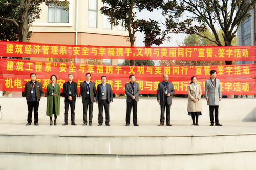 為保障學(xué)院學(xué)生身心健康,培養(yǎng)學(xué)生良好品行,有效預(yù)防青少年犯罪,對青少年的不良行為及時(shí)進(jìn)行預(yù)防和矯治,建筑經(jīng)濟(jì)管理系、建筑工程系、機(jī)電工程系與11月28日中午12:30分聯(lián)合組織學(xué)生開展了以“安全與幸福攜手,文明與美麗同行”為主題的宣誓、簽名活動。副院長任建設(shè)、呂良玉、德育工作部蘇曉紅主任、團(tuán)委書記陳卓、三系主任、書記及全體學(xué)生管理人員參加了此次活動。
