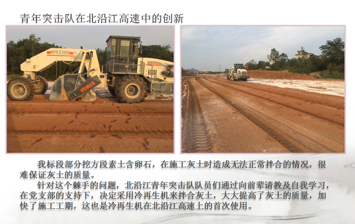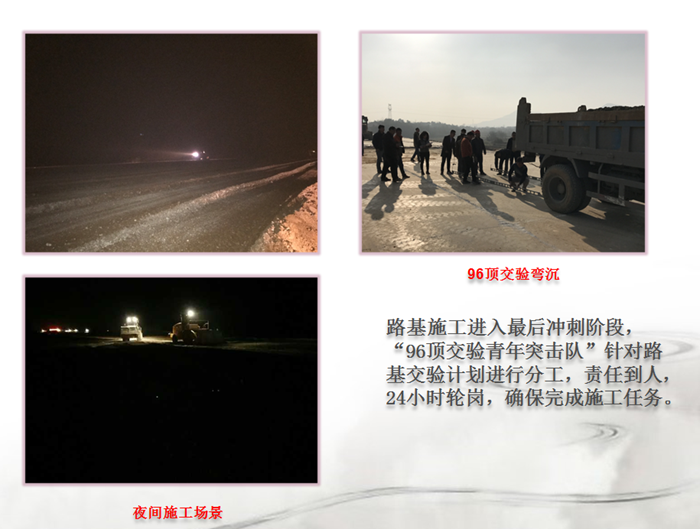 在工程建設中,該青年突擊隊圍繞“急、難、新、險、重”的任務開展了一系列活動。一是成立“96頂交驗青年突擊隊”,針對路基交驗計劃進行分工,責任到人,24小時輪崗,加快了施工進度;二是立足崗位,創(chuàng)新創(chuàng)效,采用高速液壓夯實機的創(chuàng)新工藝對臺背回填質(zhì)量進行補強,采用冷再生機拌合灰土提高灰土質(zhì)量,加快施工工期;三是規(guī)范要求,精細交底保安全,組織開展各類質(zhì)量安全文明進班組和質(zhì)量安全自查自糾活動,對施工人員進行了現(xiàn)場工序施工可視化技術交底,切實提高職工質(zhì)量安全意識,青年職工的智慧在青年文明號創(chuàng)建過程中得以彰顯和應用。
