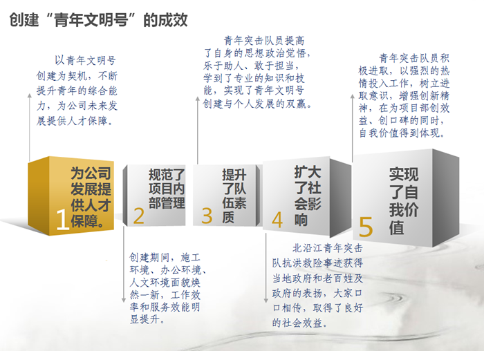 爭創(chuàng)活動中,主要圍繞8個方面開展工作。一是建立以突擊隊隊長為負責人的創(chuàng)建領導小組,定期組織上團課,加強隊員思想教育;二是開展“我為重點工程獻青春”為主題的勞動競賽活動,激發(fā)團員青年的拼搏奉獻精神;三是建立健全創(chuàng)建檔案,做好資料留存;四是以服務青年為中心,以提高工作質(zhì)量和效率為重點,創(chuàng)新工作模式;五是做好“師帶徒”,抓好“傳、幫、帶”, 設定青年人才培養(yǎng)目標,促進青年崗位成才;六是成立青年志愿者服務隊,開展志愿幫扶;七是建立青年安全監(jiān)督崗,助力安全生產(chǎn);八是結(jié)合項目實際,組織開展文體活動。