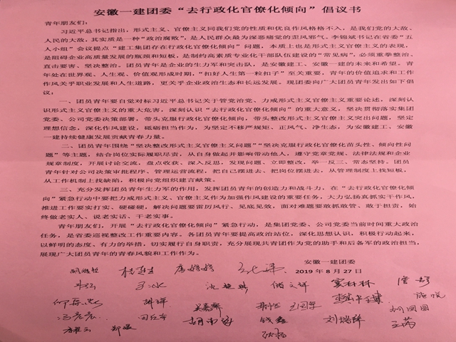 (四)在2019年的“去行政化官僚化傾向”的活動中,團委組織青年倡議活動,團員青年嚴(yán)格要求自己,不搞形式主義、官僚主義并堅決抵制,大力弘揚真抓實干作風(fēng)。同時各團支部組織青年團員結(jié)合公司的實際、自己崗位職責(zé),對公司的制度文件、審批流程、決策程序、管理制度等方面進行討論交流并提出相關(guān)的意見建議。