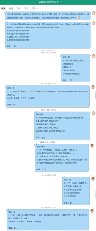 形式多樣、內(nèi)容鮮活、入腦入心,是安建建材機(jī)關(guān)黨總支開展黨史學(xué)習(xí)教育的鮮明特色。為了確保學(xué)習(xí)有重點(diǎn)、有載體、有平臺(tái),機(jī)關(guān)黨總支還開展了“每日一題”黨史學(xué)習(xí)活動(dòng),依托線上平臺(tái)將黨史教育落到實(shí)處。