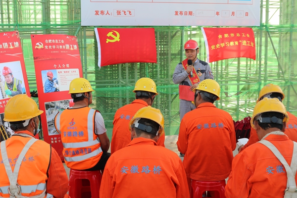 4月29日,安徽路橋繁華大道橋項目邀請全國勞動模范王開庫開展黨史學習教育進班組活動,為一線工人宣講黨史故事。