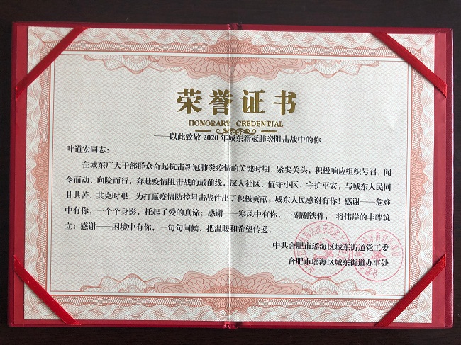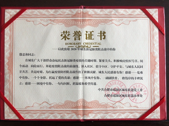 4月26日,中共合肥市瑤海區(qū)城東街道黨工委、合肥市瑤海區(qū)城東街道辦事處對葉道宏、滕忠和兩名同志在新冠肺炎疫情防控中的突出表現(xiàn)予以表揚,并發(fā)放榮譽證書,證書中寫道:“城東人民感謝有你!感謝—危難中有你,一個個身影,托起了愛的真諦;感謝—寒風中有你,一幅幅鐵骨,將偉岸的豐碑筑立;感謝—困境中有你,一句句問候,把溫暖和希望傳遞”。深情的感謝,承載了城東人民無限的心聲,眾志成城抗疫情,萬眾一心戰(zhàn)病魔。同時,希望廣大黨員干部、職工積極向他們學習,繼續(xù)發(fā)揚大公無私、樂于奉獻的精神。