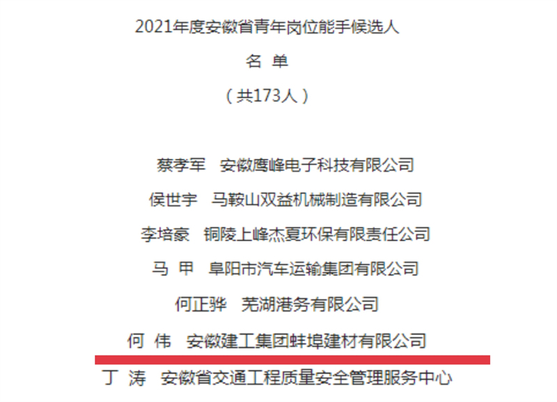 近日,共青團(tuán)安徽省委傳來喜訊,安徽建工建材科技集團(tuán)有限公司職工何偉被授予“2021年度安徽省青年崗位能手”榮譽(yù)稱號。