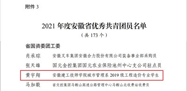 近日,共青團安徽省委作出關(guān)于表彰2021年度省優(yōu)秀共青團員的決定,授予173人“安徽省優(yōu)秀共青團員”稱號。安徽建工技師學院城市管理系2019級工程造價三年高級班學生黃宇翔獲得此項榮譽。他用汗水編織未來,用毅力成就夢想,用拼搏鑄就輝煌,用實際行動踐行“請黨放心,強國有我”的青春誓言。讓我們向榜樣學習,為他點贊。