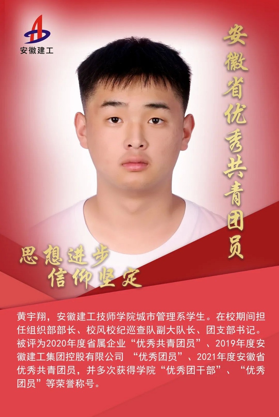 黃宇翔,男,漢族,2002年7月出生,共青團員,安徽建工技師學院城市管理系學生。在校期間擔任安徽建工技師學院城市管理系團總支組織部部長、校風校紀巡查隊副大隊長、團支部書記。被評為2020年度省屬企業(yè)“優(yōu)秀共青團員”、2019年度安徽建工集團控股有限公司“優(yōu)秀團員”,并多次獲得學院“優(yōu)秀團干部”、“優(yōu)秀團員”等榮譽稱號、獲校級二等獎學金和工程算量技能大賽優(yōu)勝獎。黃宇翔同學多次主動參加新冠肺炎疫情防控工作,并積極參與2021年7月河南洪水的志愿救助工作,表現(xiàn)突出,志愿服務時數(shù)更是達到了近400小時。在同學眼中他是熱愛生活、積極向上的好朋友,在長輩眼中,他是艱苦樸素、勤奮孝順的好孩子,在老師眼中他是認真工作、熱愛學習的好學生,更是廣大團員青年的好榜樣。