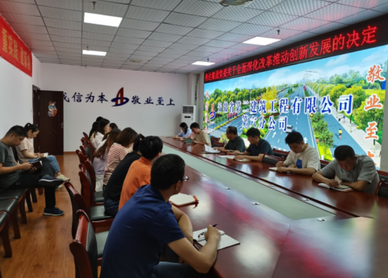 第五公司機關和項目黨支部傳達學習安徽建工集團全面深化改革推動創(chuàng)新發(fā)展動員部署暨主題教育黨課報告會精神。會議要求,一要切實提高政治站位,充分認識深化改革的緊迫性和必要性,全面貫徹落實集團黨委的決策部署;二要以全面深化改革為契機,找準定位、對標對表,立足崗位、擔當作為,錨定年度各項目標任務抓落實,全力沖刺促發(fā)展;三要攻堅克難、砥礪奮進,緊密結合實際,進一步優(yōu)化組織架構,全力開拓市場,降低管理成本,夯實項目管理,助力公司開創(chuàng)高質量發(fā)展新局面。