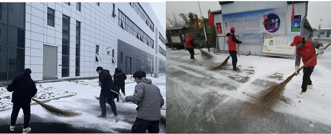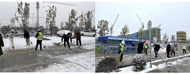 第四工程公司組織青年團(tuán)員清掃項目部、道路兩旁積雪。
