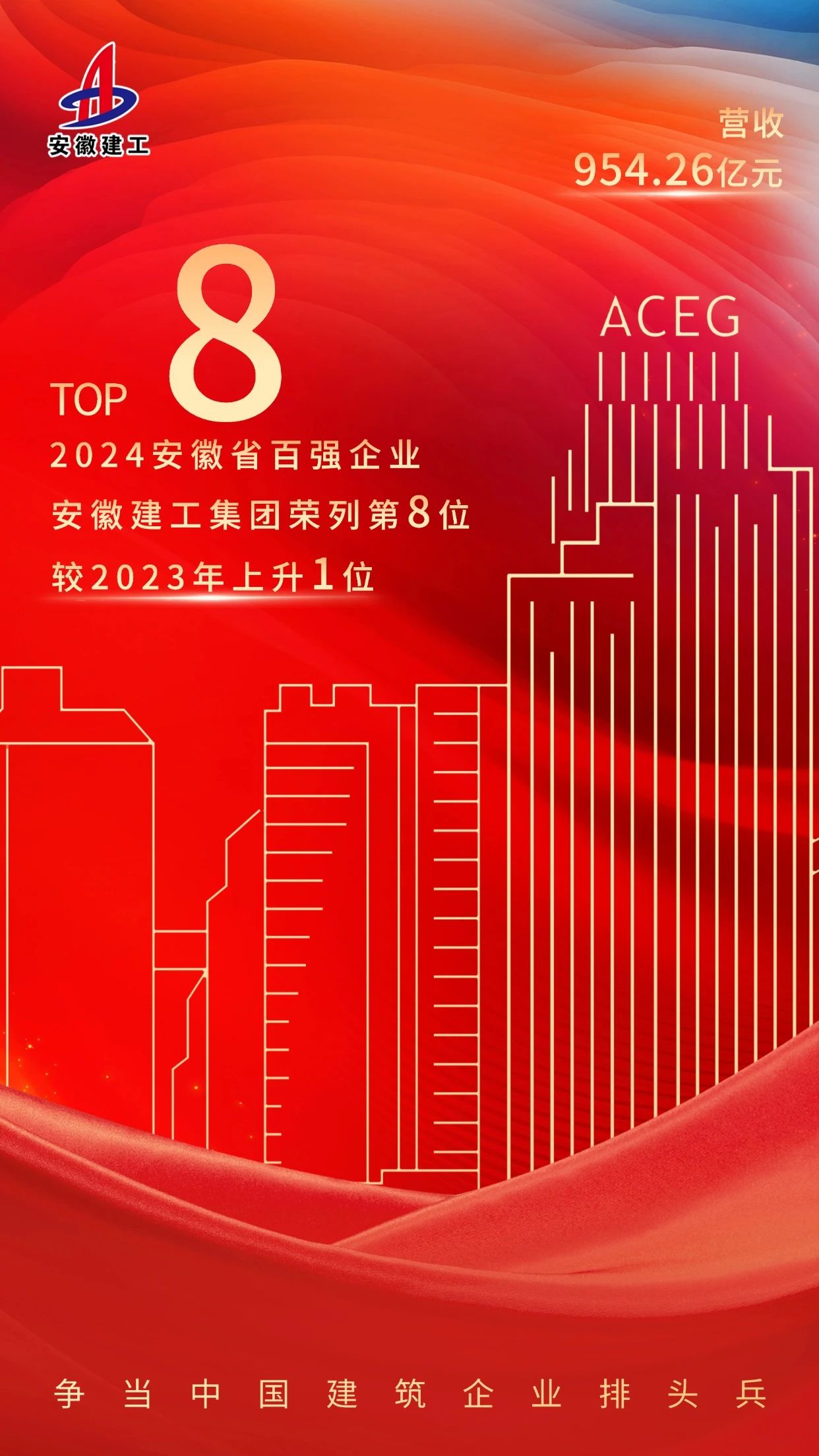 11月23日,安徽省企業(yè)聯(lián)合會、企業(yè)家聯(lián)合會發(fā)布“2024安徽省百強(qiáng)企業(yè)榜單”,安徽建工集團(tuán)控股有限公司以營業(yè)收入954.26億元的成績榮列“2024安徽省百強(qiáng)企業(yè)”榜單第8位,較2023年上升一位。