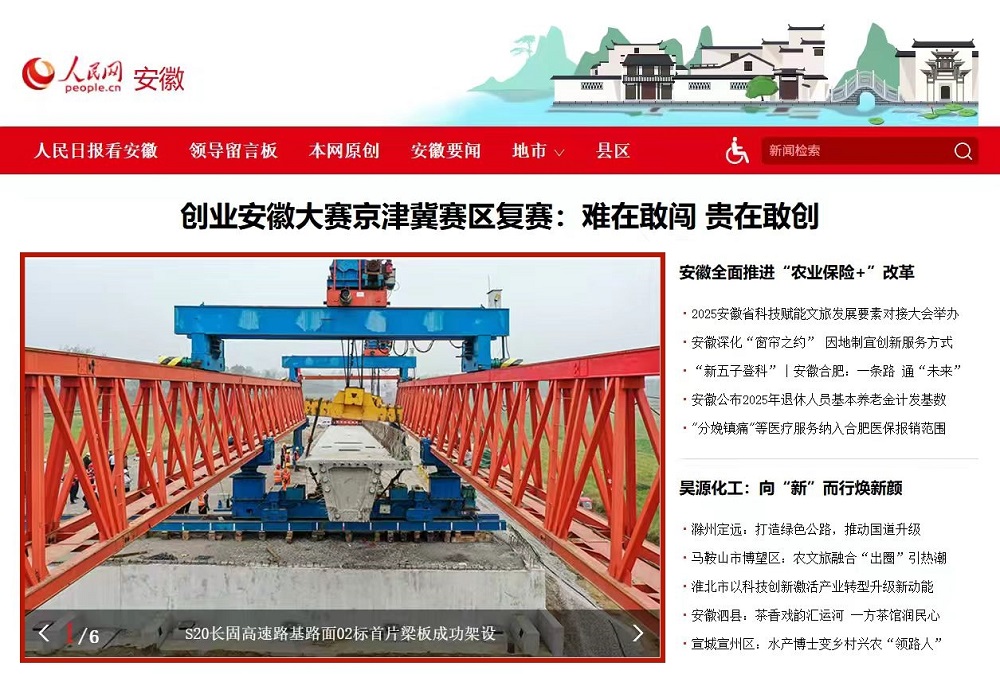 2025年10月15日,建工建投集團(tuán)S20長(zhǎng)固高速路基路面02標(biāo)首片梁板成功架設(shè)。人民網(wǎng)記者深入項(xiàng)目一線(xiàn)展開(kāi)報(bào)道,稿件登上人民網(wǎng)安徽頻道首頁(yè)。