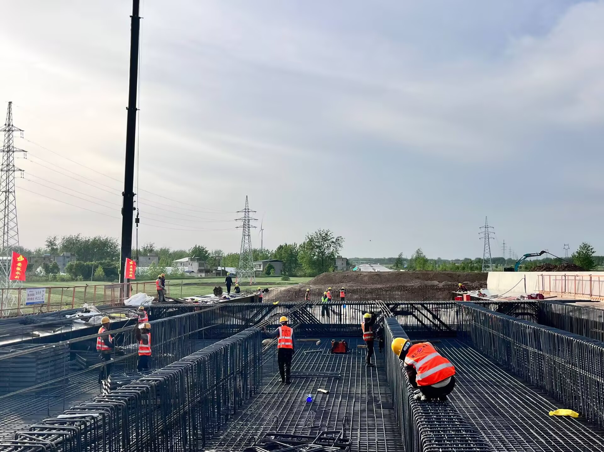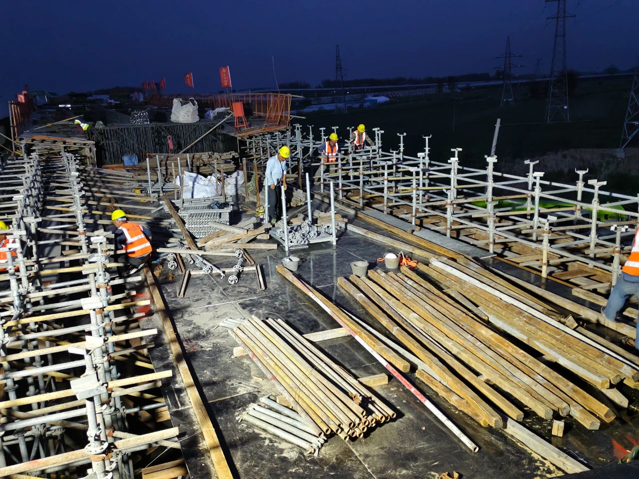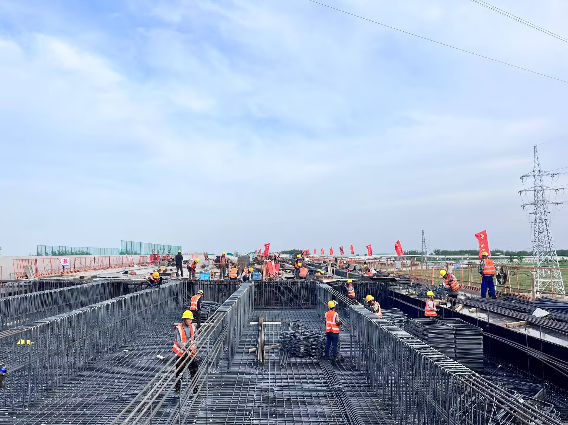 前期由遷改工原因,潁臨高速路基05標(biāo)公橋樞紐內(nèi)D匝道橋和阜(陽)淮(濱)分離立交橋的一聯(lián)二跨連續(xù)箱梁現(xiàn)澆、一聯(lián)四跨連續(xù)箱梁現(xiàn)澆、一跨25米預(yù)制箱梁安裝(均包括樁基和下部結(jié)構(gòu))未能開工。在經(jīng)過項(xiàng)目多次積極主動聯(lián)系業(yè)主單位及遷改單位,積極配合遷改施工情況下,2025年3月1日影響項(xiàng)目全線貫通的35KV高壓桿線順利拆除完成。項(xiàng)目隨后立即組織編排施工計(jì)劃,倒排工期,合理配置人材機(jī),迅速啟動樁基施工,過程中加強(qiáng)管理及時(shí)調(diào)整施工計(jì)劃,增加人員設(shè)備投入,經(jīng)過近一個(gè)半月的日夜奮斗,目前樁基下部及梁板安裝已完成,現(xiàn)場施工體系已迅速完成轉(zhuǎn)換,進(jìn)入橋面系及現(xiàn)澆箱梁施工階段,經(jīng)過與地方交通局及各級主管單位的溝通協(xié)調(diào),項(xiàng)目及時(shí)解決D匝道橋現(xiàn)澆段跨318省道門洞搭設(shè)及省道兩側(cè)限高通行交通管制問題,確保施工任務(wù)能按時(shí)完成。