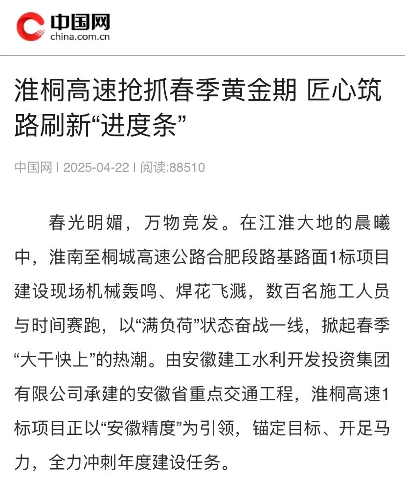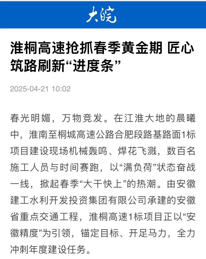 建工水利淮南至桐城高速公路合肥段路基路面1標(biāo)項(xiàng)目建設(shè)現(xiàn)場機(jī)械轟鳴、焊花飛濺,數(shù)百名施工人員與時間賽跑,以“滿負(fù)荷”狀態(tài)奮戰(zhàn)一線,掀起春季“大干快上”的熱潮,全力沖刺年度建設(shè)任務(wù),受到中國網(wǎng)、大皖新聞等主流媒體關(guān)注報道。