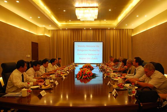 In addition, President Hu participated in the signing ceremony of Friendly Relationship Establishment Agreement between Anhui province and Region Usti presided by Mr. Wang Sanyun, Governor of Anhui province and Ms. Jana Vanhova, Governor of Region Usti, Czech. President Hu was also present on the occasion when Ms. Hua Jianhui and Mr. Tang Chengpei, the two vice governors of Anhui province entertained the delegation from Czech .