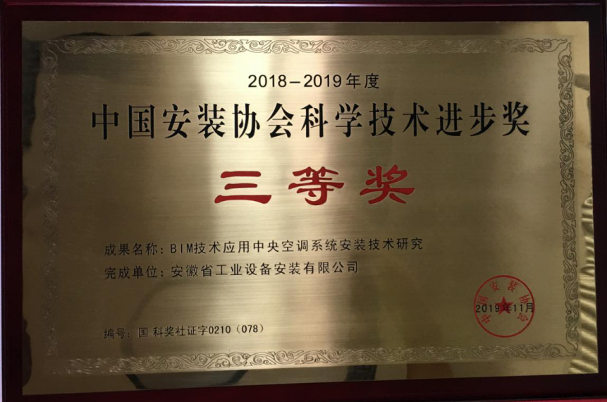 The research subject - Research on BIM (Building Information Modeling) Technology Application for Installation Technology of Central Air-conditioning System, developed independently by ACEG Industrial Equipment Installation Co. Ltd. – one of ACEG`s subsidiary, professionalized contractor for industrial equipment and facility Installation and engineering, won the third-class award of 2018/2019 China Installation Association Science and Technology Progress. The medal and the certificate of the award were issued on August 15, 2020.