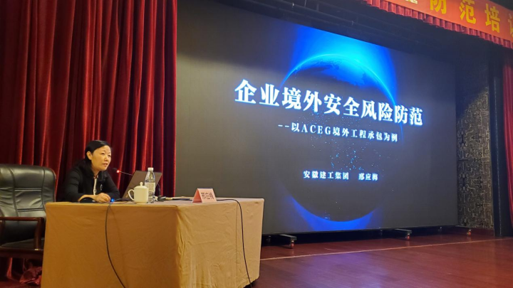 July 15th / Hefei / Ms. Xing Yingmei, Deputy General Manager of Anhui Construction Engineering Group Co., Ltd and Secretary of General Party Branch and General Manager of ACEG Overseas Business Department, was invited to give a special lecture by the sponsor of Risk Prevention Training Course for Biz Overseas – a program organized by Anhui Provincial Department of Commerce,aiming to improve the awareness and ability of foreign-related practitioners to deal with all risks imposed from foreign-related businesses. The title of Ms. Xing Yingmei’s lecture was: On security risk prevention for enterprises in dealing with foreign-related businesses. Some 200 persons in charge of commercial departments of all cities and foreign trade enterprises in and out of Anhui Province took part in the event.